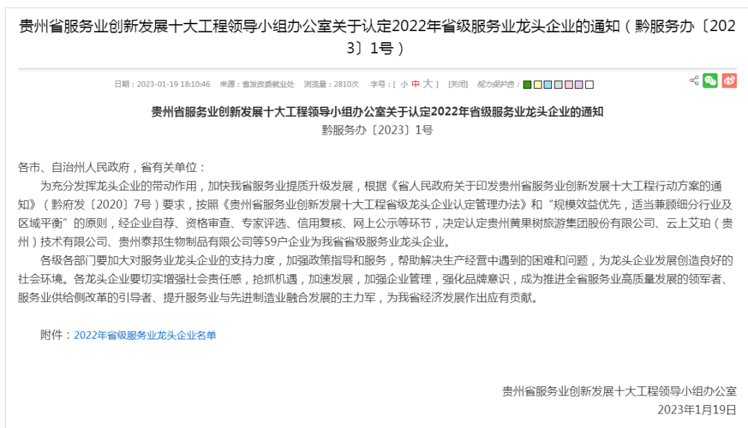 1月19日,贵州省服务业创新发展十大工程领导小组办公室发布关于认定2022年省级服务业龙头企业的通知,贵阳国际会议展览中心有限公司榜上有名。